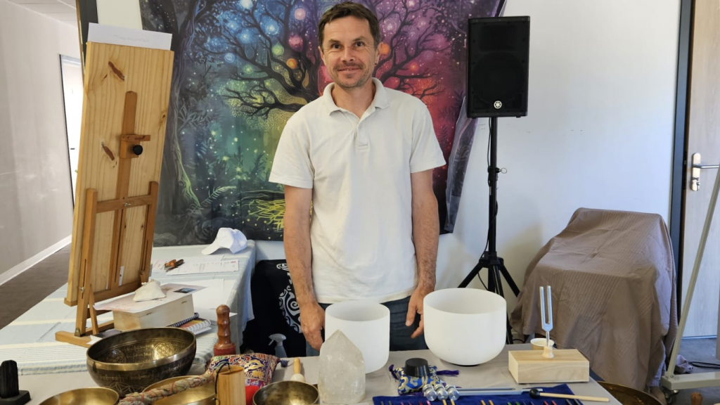 Soin quantique aux vibrations des bols chantants et douche sonore dans le bol géant.